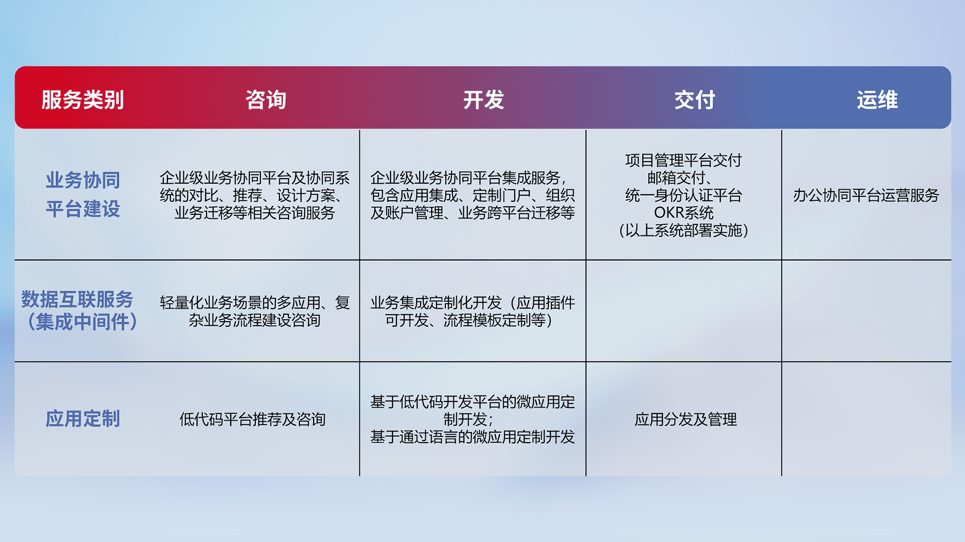 针对钉钉、、企微、、、、IDaas等平台级产品提供产品的规划、、、方案、、、交付、、、、定制化开发等服务,,,,实现如统一协同办公、、、智能客户服务、、、、混合会议管理、、、、智能数据查询、、、、等业务场景,,,实现数字化转型。。